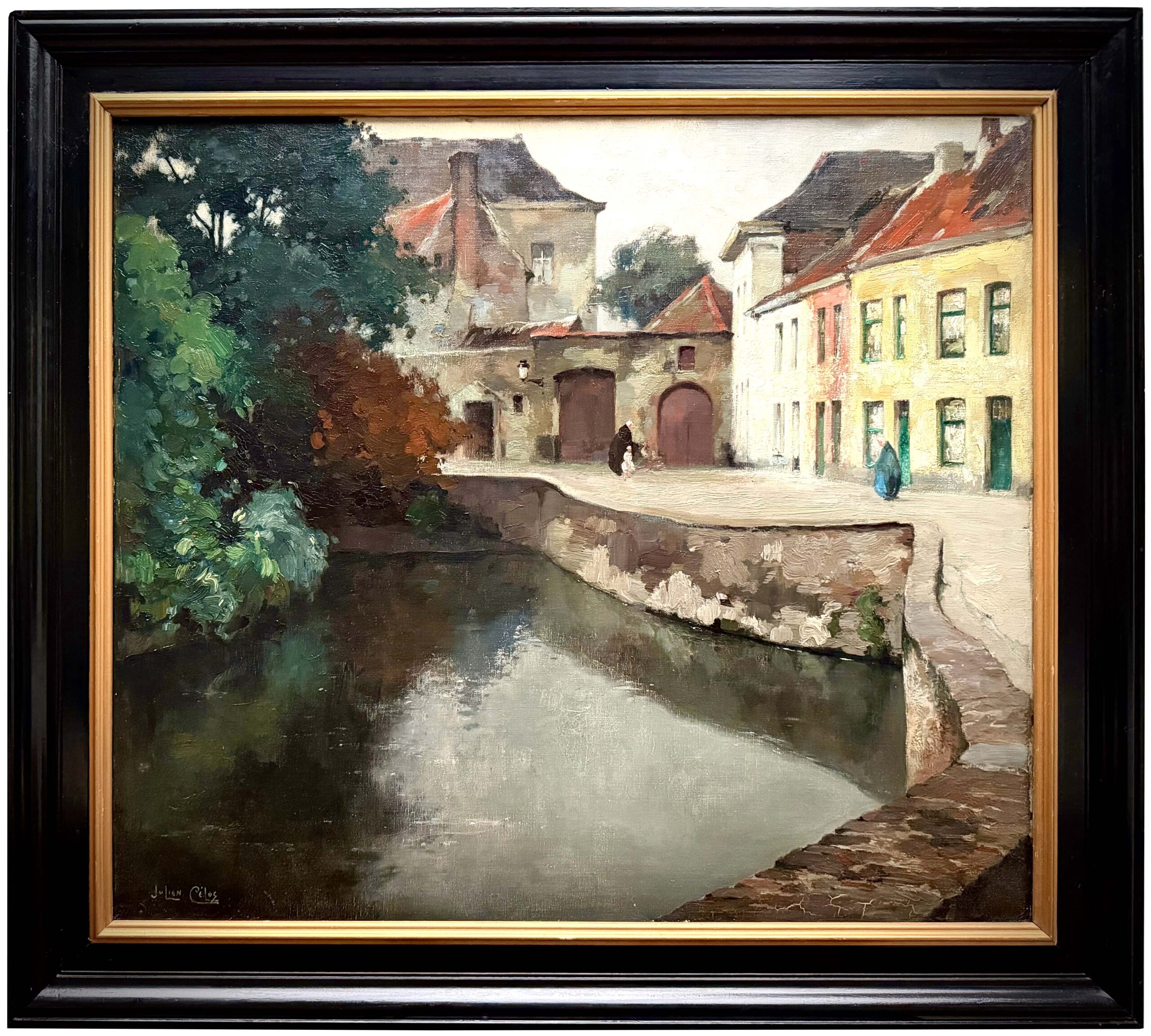 After the war, Julien Célos maintained an active career, holding numerous solo exhibitions in Antwerp (at the Wynen Hall on the Meir) and in Brussels, notably at the Galerie de la Toison d’Or and Galerie Le Studio. He regularly took part in the exhibitions of the Cercle Artistique et Littéraire during the 1920s, including in 1928 when his painting Quai de la Main d’or (Bruges) appeared in the catalogue.