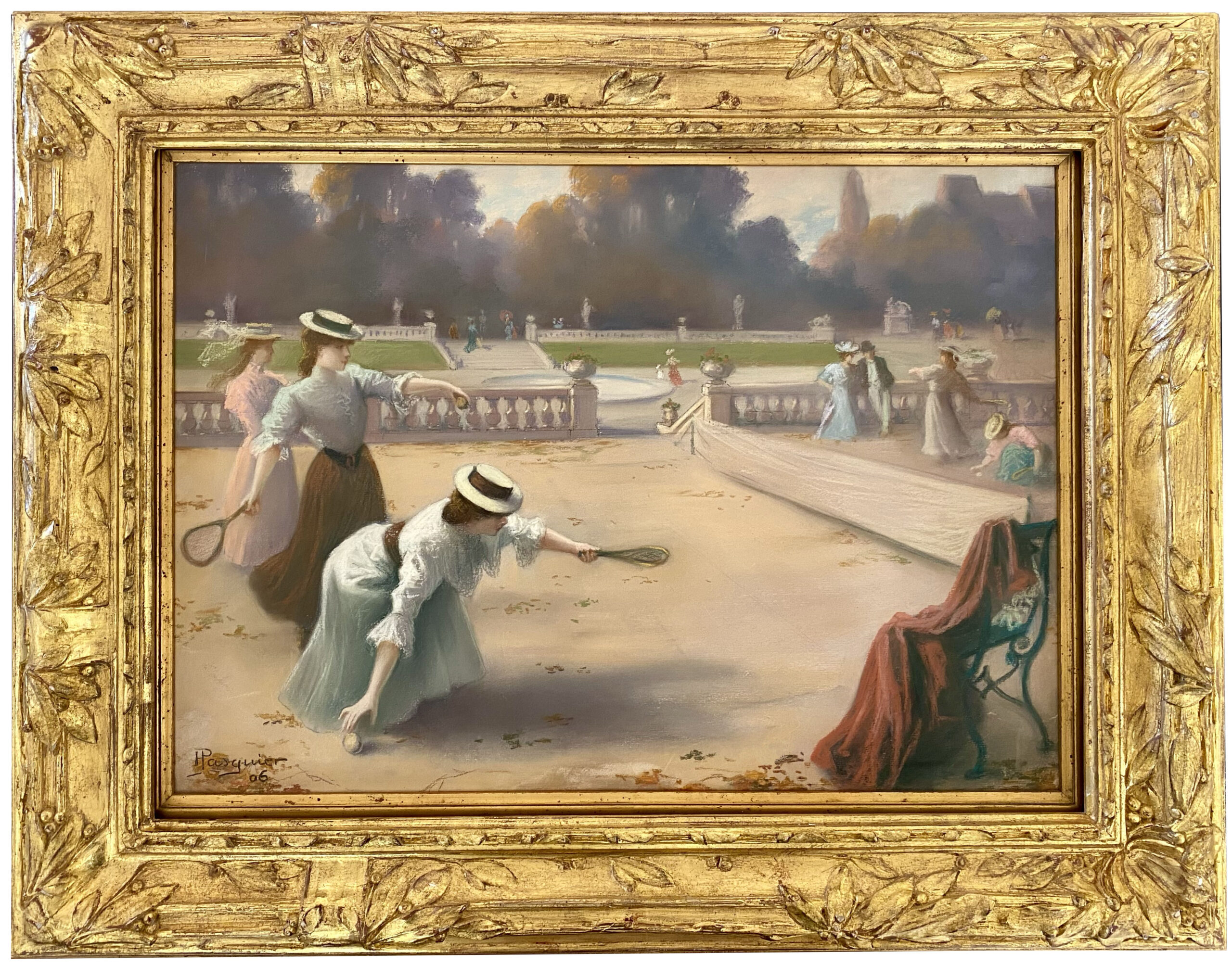 Lawn Tennis at the Castle Park, exemplifies his ability to convey both atmosphere and nuance. The painting captures a serene moment in the grounds of a castle, where elegantly dressed figures either participate in a game of lawn tennis or watch from the sidelines. Framed by verdant foliage and graceful architecture, the scene evokes the leisurely rhythms of aristocratic life during the Belle Époque. Pasquier’s soft palette and fluid, impressionistic brushwork infuse the composition with a sense of movement, lightness, and genteel sociability.
